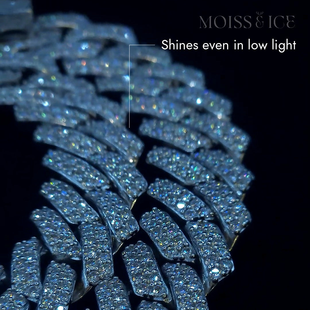 Elevate your style with The Jiya by MOISS & ICE a bold Moissanite Cuban Bracelet designed for both men and women. Handset with D-color, VVS+ clarity moissanite stones, each link reflects light with unmatched brilliance.